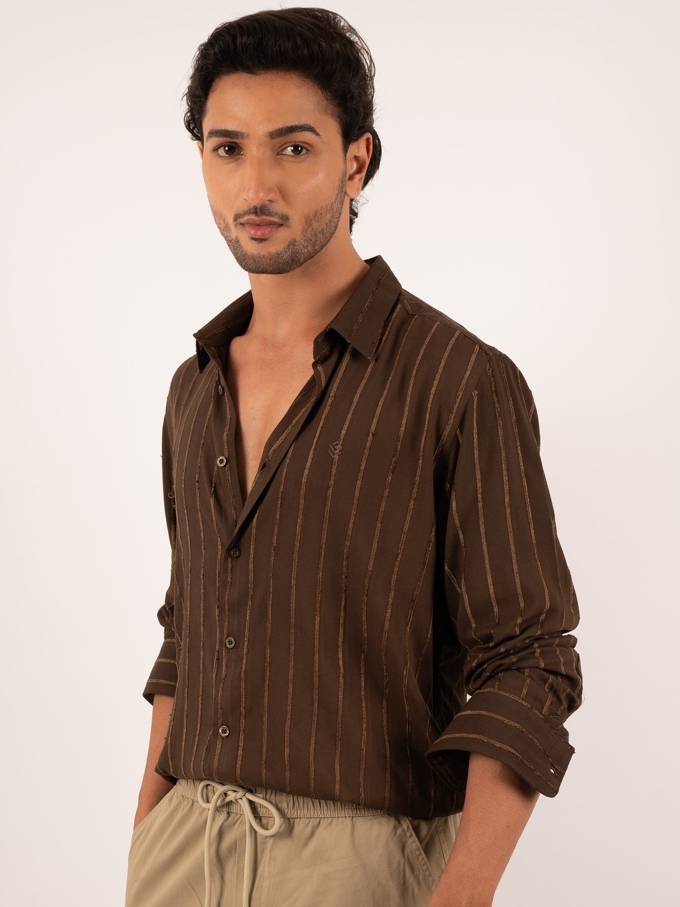 Add a touch of refined style to your wardrobe with this elegant brown shirt featuring vertical gold stripes. Designed for both comfort and sophistication, this shirt is perfect for casual outings, semi-formal events, or a smart everyday look. The subtle gold detailing adds a hint of luxury, while the soft fabric ensures breathability and ease of movement throughout the day.