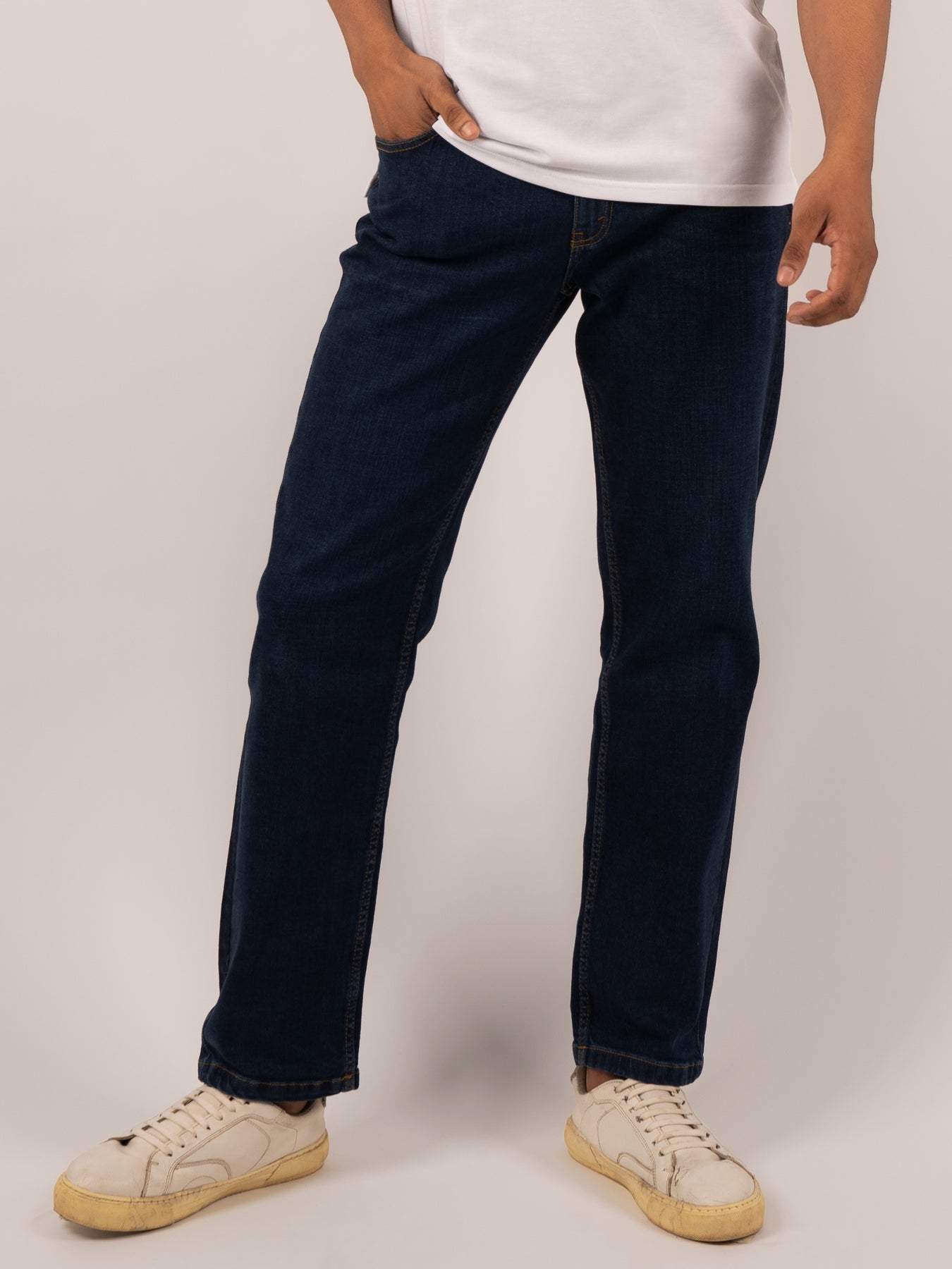 Deep slate blue and soft to the touch, these straight-leg jeans offer subtle structure with built-in stretch. Perfect for layering with shirts or tees, they bring polished ease to your daily rotation.